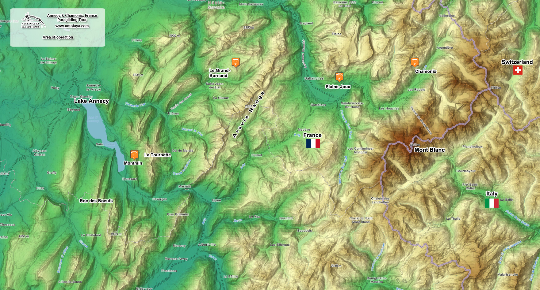 This trip takes us to the two most iconic paragliding spots in French Alps: Annecy and Chamonix. The area is the Alps' mecca for free flight perfectly set up for paragliding. It is set against a spectacular landscape of mountains, glaciers, and lakes. At lake Annecy you can soar vertical limestone walls, fly above the blue waters of Europe’s cleanest lake, and follow mountain ridges ideal for cross country. Above Chamonix one flies around ice-capped mountains, glaciers, and gigantic rock walls. It is one of the most jaw dropping paragliding sites in Europe lying at the base of the Alps' highest mountain - Mt. Blanc. Note: This trip is back-to-back with our Slovenia tour and the XC Camp tour. For pilots participating in more than one tour we provide free transportation between the trips' locations. |