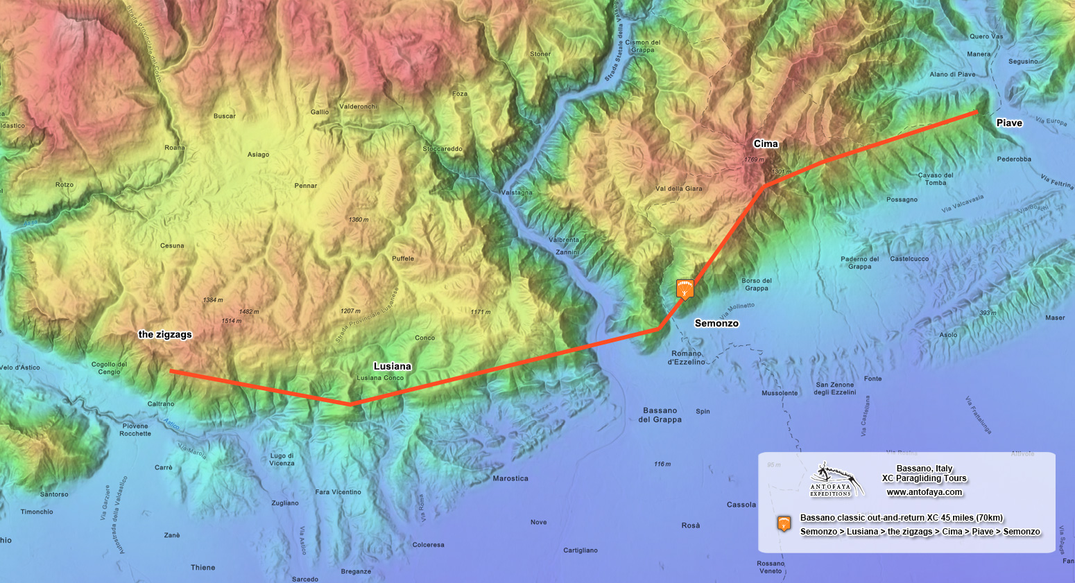 The Bassano ridge runs East to West for miles. Its slopes are covered with grass and vegetation and the valley is filled with Italian villages and vineyards. Various takeoffs in the area provide great start for XC along the ridge and out into the flats. PG World Cups and World Championship took place here. This and abundant infrastructure for pilots turned the place into a free flying mecca. Plenty of pilots come here not only for flying but for cultural and culinary experience, too. Expect a few hours flights and XCs. |