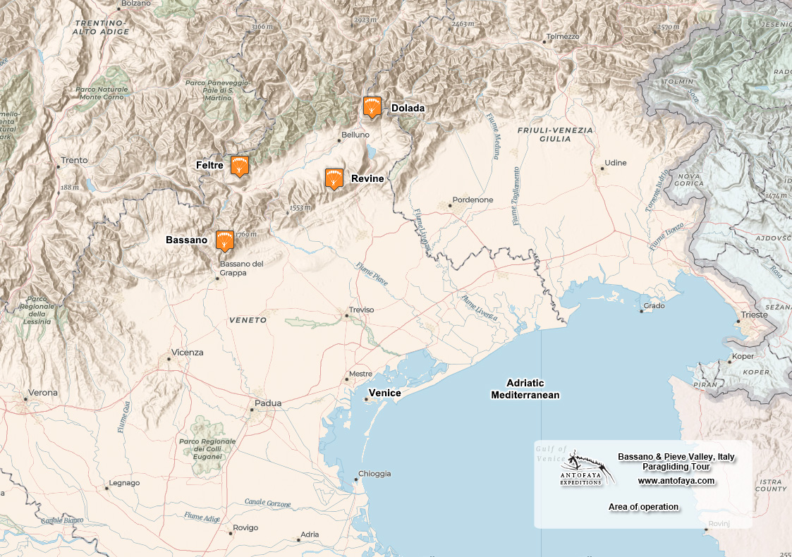 Piave Valley stretches West-East between towns of Feltre and Belluno. The Northern flanks of the valley are where the very first ranges of the Dolomites start. The valley offers two major takeoffs on both ends: Monte Avena at the west end and Dolada at its east end. |