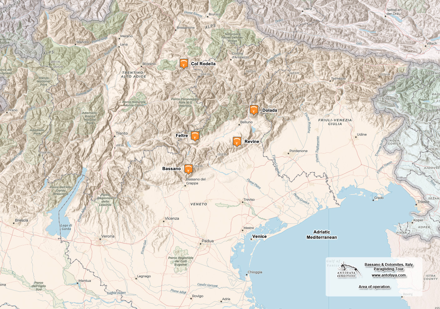 Every day we will choose our flying location based on weather forecast. The Basano area is always the most reliable. Then, if flying weather allows, we will go for a day trip to Val Belluna valley (Feltre or Dolada). Yet, if the weather is even better we will fly the Dolomites in Val di Fassa (Col Rodella). |