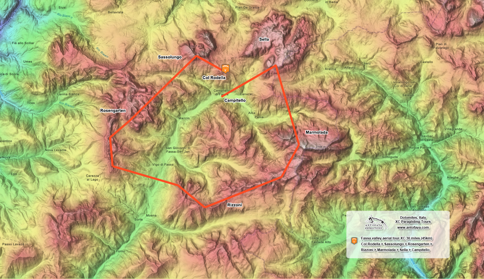 Flying sites on the "menu" for this tour: • Fassa valley, Dolomites, Italy (Col Rodella) - Fascinating and breathtaking, worldwide famous for the best flying in the Dolomites, |