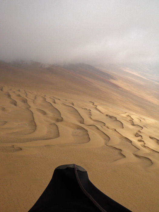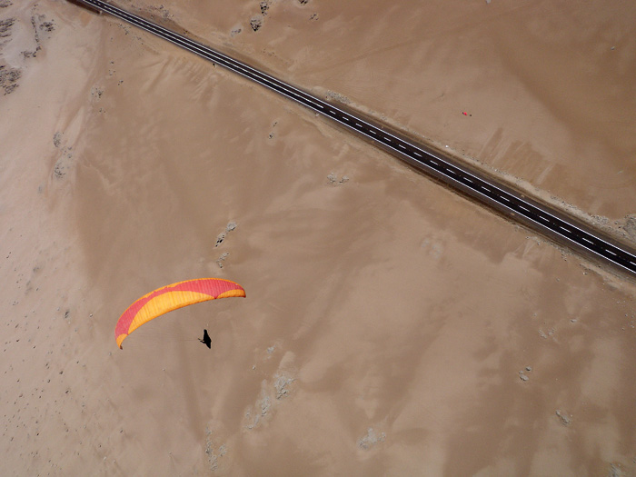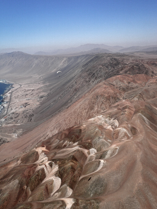 It virtually never rains here. A few misty clouds may form, but in November, cloudy days are usually good flying days. The rare vegetation you see in town is all irrigated, fed via pipeline from the far away Andean snow fields. Drive east and up to the desert - nothing whatsoever. No rain, people, vegetation, animals, birds, bugs. Nothing except sand and rock. When NASA needs to simulate Mars, they come here. This is what makes Iquique such an amazing place to fly. The cold Humboldt Current that originates in Antarctica runs north along the coast. As the cool ocean air flows inland, it rolls over the warm coastal sand, then flows up the coastal ridge to create a seemingly never-ending mass of rising air. Instead of working to stay up in a thermal, it can be more work to get down. You rarely find huge strong thermals here, just lift everywhere. It's also rare to get above 4000 feet, but you can stay at the top of the lift all day. This allows long XC flights without the need for oxygen or heavy clothing. I have never traveled to the Galapagos, though it is a place I would love to visit. There are places on Earth that we should all see, but because we help ruin them through the mere act of visiting them, we are probably better off just leaving them alone. Send a film crew, document it for all to see, then just don't go back. Iquique is sort of like that. I hate to tell anyone how wonderful it is, for fear they'll all want to go. Fortunately, in the vast Atacama, there is still plenty of empty space for flying. |