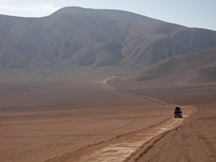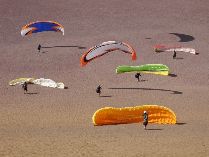 Ned: What a week! On day two, Ken, Jarek, and I flew 25 miles XC from Alto Hospicio, our morning launch, almost to the airport, then back to a lunch spot, Los Verdes, where we met up with the group for great seafood, fresh out of the ocean. Then on Saturday and Sunday, we drove to two sites: San Marcos, about 70 miles south, and Chipana, about 100 miles south. I flew a 50 mile XC from San Marcos, my personal best, back past the airport, past Los Verdes where Jarek landed, a few miles more to Palo Buque, and then (after a low save), back to Los Verdes for a late lunch. I was in the air just over 4 hours. Now, on Monday, we were headed north. We met at 6:30 am and drove to Pisagua, a little fishing village almost 100 miles north of Iquique. Our morning launch, on the mountain just south of town was pretty windy, and high pressure kept a lid on things. However, I got up my courage, launched off the 2000-foot cliff, and had a fun one hour flight. In the quaint little village, we ate awesome ceviche and giant swordfish steaks at the local restaurant. Then it was off to the main event: Tiliviche Canyon, about 4 miles north of town. This is another site where you launch at the bottom and fly up. Occasionally, Tiliviche Canyon has running water from the Andes. Today it was dry. We crossed the sandy riverbed in our trusty turbo-charged, 4-wheel-drive Mitsubishi vans and stopped at the bottom of a west-facing mountain, half a mile from the ocean. Shouldering our gliders, we hiked a hundred feet up a sandy slope. I was third to launch, and after a bit of scratching, I made it above the band of cliffs half way up the mountain. The south side of the mountain facing the canyon was off limits, due to a dangerous venturi. However, it seemed the best lift was over that way. I flirted with the lift, just beyond the canyon, gaining another 600 feet. However, I soon reached the edge of my comfort zone. The thermals were small and sharp, and too close to the jagged cliffs. It's natural to head where the other pilots are having success. And when the lift is light, it's natural to scratch. Sometimes, though, it's best to go the other way. Which I did, putting some safe distance between me and the cliff. And then – BANG! It was a screamer of a thermal – 900 feet per minute! It started small and sharp, and I was banking hard, but as I popped up over the mountain, it mellowed and widened. Far below, I saw the other pilots leaving the cliffs and heading out front to my thermal. Why is it such a thrill to be the top glider? I couldn't help but radio a couple of former top-of-the-stackers about how nice their gliders looked from above. My grin wouldn't stop. I headed further north, out front of where Ken was working some weak ridge lift just below the band of cliffs. Found another nice thermal and started circling tightly. The next thing I knew, Ken was there with me, and soon we were spinning tight circles in perfect unison, almost wingtip-to-wingtip in a dizzying ballet. I bailed first as the thermal weakened, and found myself above an amazing plateau of a hundred undulating little peaks and dips stretching half a mile north and west. The late afternoon sun emphasized the colorful, jagged texture. The plateau sat atop a point that jutted west from the mountains all the way to the sea. I circled slowly, entranced by the beauty below. As I gained altitude bit by bit, an idea began to form. Could I go up the coast by flying over the plateau? Did I dare? What if I had to land in the middle of those badlands? I circled a bit higher. The wind was starting to shift south a bit – which would help push me across. But how would I ever get back, going all the way around the point with a headwind? Well, I could walk, couldn't I? So I went for it. I made it over the plateau, but on the other side, I was sinking fast. I pushed full bar to cross the bowl on the lee side of the plateau, and headed for a slightly south-facing cliff. No lift there. Another minute and I would have to land. I scratched. Sank. Went further north – and found some lift, as you always do in the Atacama! I was out of sight of the rest of the gliders on the other side of the point, but as I climbed into view, they headed my way. After I successfully flew back around the point and landed at sunset, Jarek told me that only two other pilots – experienced locals – had ever flown past the point. I had led a whole gaggle there. Two days later I was on my way home. I flew higher, farther, and longer than I had on any other trip. In the course of a week, Ken and Jarek took us to seven different launches spanning 180 miles of amazing coastline. I flew every day – eight days all together – including my arrival and departure days. In fact, I have never been unable to fly in the Atacama. The lift is the most consistent I have ever flown. All this is what keeps me coming back. |