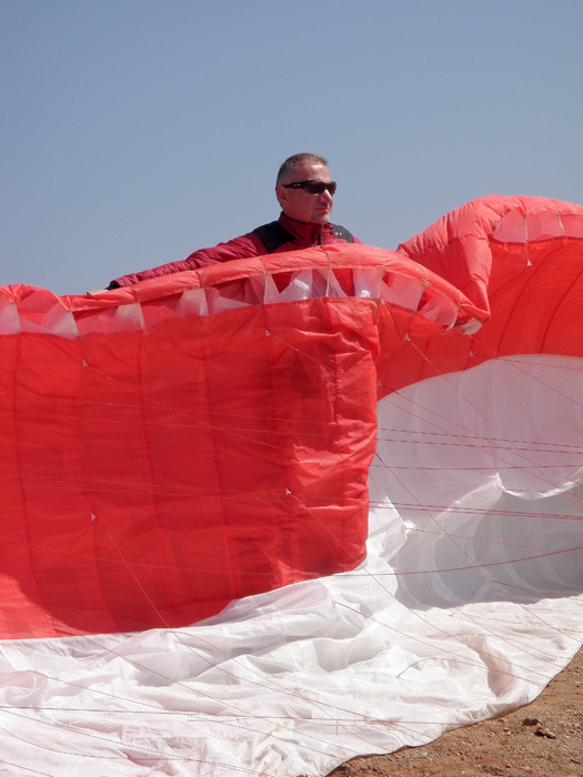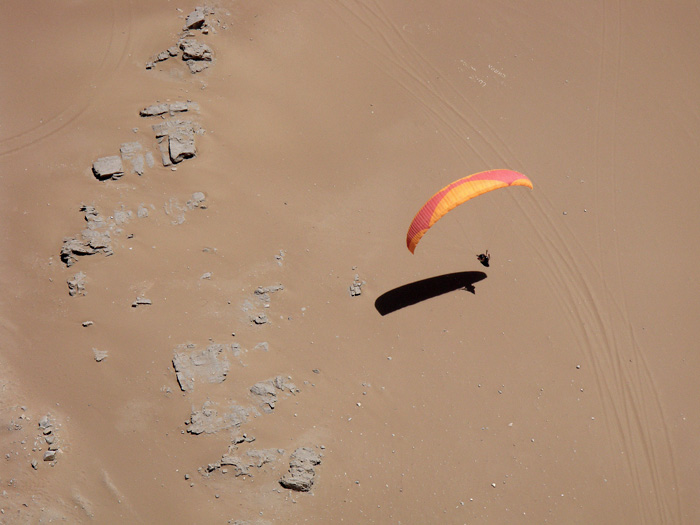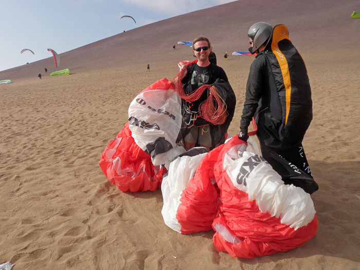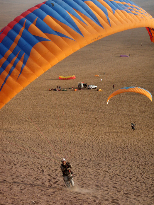 FLYING THE ATACAMA DESERT Ned: I must admit, I was a bit stressed. I was already a day late, due to my hectic work schedule. After a delay in Dallas, I arrived in Santiago, Chile too late to make my connection to Iquique. So my plane touched down at the Iquique airport at 4:15 pm – two hours late. I didn't want to think about my buddies flying without me. Fortunately, I made my next flight – about a half hour later . . . with my paraglider. I was met at the local airport by Jarek, and we were on the road within minutes. Six miles later, we left the highway and drove cross-desert to Palo Buque. A number of wings were already in the air. I zipped my flying suit over my travel clothes, found my radio and vario, and started kiting my wing up a small, sandy hill. Soon I felt a good thermal grab my wing – just as I hoped. Skidding along for a few feet to accommodate the gust, I checked my inflation, turned quickly, and was airborne! It was just after 5 pm. After one trip back and forth on the little hill, I had enough altitude to cross to the main mountain, where I worked the lift, scratching back and forth over the soft sand. Two thousand feet above, I could see wispy little clouds starting to form. I kept scratching until I had 500 feet to play with, then headed out away from the mountain in search of real lift. I found sink instead. I kept my heading for a couple of minutes in minimal lift – and there it was! A bubble. Just tickling my outside wingtip. Turning that direction, I was soon coring a strong but smooth thermal. Eight hundred feet up, it started to peter out, so I turned toward the mountain again. By then I was reaching the bottom of the cliffs, where I found the house thermals, and was soon at cloudbase, almost two thousand feet above launch. I flew south for a couple of miles to try to reach the Mystic Dunes, but with the goal in sight, I was defeated by moderate sink and strong headwinds. So it was back to Palo Buque to play. Not far below, Chuck had landed on the sand near the top of the mountain, just for fun. After a while I could see the rest of the group starting to land by our vehicles. Time to come down. But I had lots of altitude to play with, so I headed toward the azure Pacific, two miles away. I figured I could take it on glide and still make it back to the vehicles with 300 feet of altitude. Not so. I was in that magic zone, just below the wispy clouds, the last thermals gently lifting off the desert as the cooler ocean air pushed in underneath. I was flying in zero sink! As I neared the ocean, I made a 180 and headed back over the LZ. Off to the west, a large orange sun was sinking into the sea. Far below, the vehicles looked like toys and the people like ants. A couple of the ants were waving their arms at me. I heard a voice on the radio starting to say, "Ned, Ned ..." in a Polish accent. I turned it off. I was the last man flying. I started some aggressive turns to lose altitude. Then big ears. It was hard work to get down, but I'm a hard worker. I was only 300 feet up when my right wingtip lifted. I swear my glider started circling all by itself, with the vario singing happily in my ear. Yee-hah! I looked down, another thousand feet higher. The ants seemed agitated. So, reluctantly, I flew out of the lift, circled tightly for a while, and then it was time to land. Which I did, at dusk, just two hours after arrival. I usually take one exotic paragliding trip each year. Previously, it was somewhere different each time. However, like Jarek, I seem to have settled on Iquique. And why not – it offers the best flying in the world! Smooth, consistent lift. Perfect temperature. Unlimited landing zones. The contrast between the blue Pacific Ocean and the stark beauty of the Atacama Desert. Great food. Great company. Friendly people. New flying sites each trip. And a high rise condo on the beach. |
