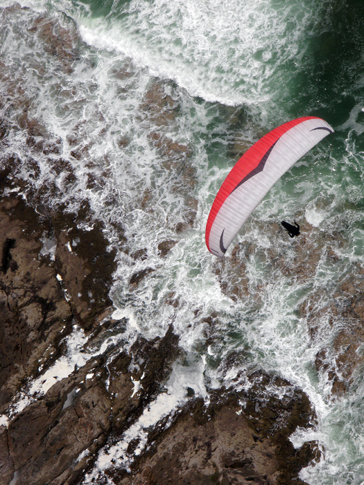 Chuck: Cross country flying is so easy here that even I give it a shot. We drove about an hour south of Iquique, headed up into the high desert, past the big salt mine, then another hour or more south, finally back towards the ocean. Our launch was over 2000' above Playa Chipana, a huge coastal plain below the ridge, and one HUGE LZ. The launch has sharp rocks, so we laid out a tarp to protect our wings. From here, it is possible to fly well over 100 miles north along the coast, but I am usually happy with about 20 miles or so. After a thorough briefing from Jarek on how to work the winds and terrain, and more importantly where NOT to go, we launch. Our group of about 8 works its way along the ridge, enjoying the view as much as the easy flying. We keep a constant eye on the ocean, as it will tell us when the winds are getting strong enough to create rotor zones around the rocky points that jut out into the sea. The long distances here are possible when the winds behave and the lift stays strong enough for you to get high (5000' is high here) before crossing some of the gaps in the ridge. November is most favorable. The two most challenging gaps are called "cemeteries," as lots of flights end there. If the winds switch too far south, then the rotor zones also become obstacles to fly over, not through. When I got to a major point, 20 miles along, I turned south to check my groundspeed into the wind, and immediately knew that there would be strong rotor on the other side, so opted to ridge soar for a bit longer before landing. Several of us landed between the coastal highway and the surf zone, picking up some lifty bumps as we descended the last 200' or so into the soft sand. Our drivers were still over an hour away, as the only road back down to the highway is back around through the desert. While we waited, we hiked the beach, watched the sea lions and the sea life in the tidal pools. If you're a free diver, you can jump right in to hunt up your lunch of sea urchin or abalone. Every place you land here is an adventure in itself. |