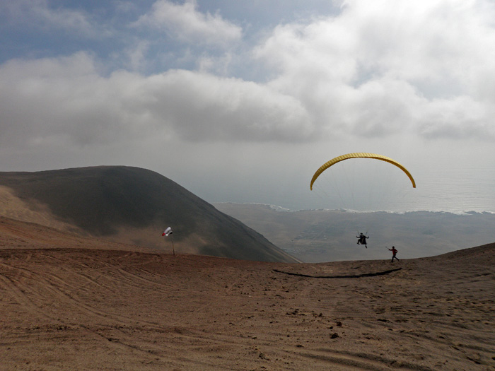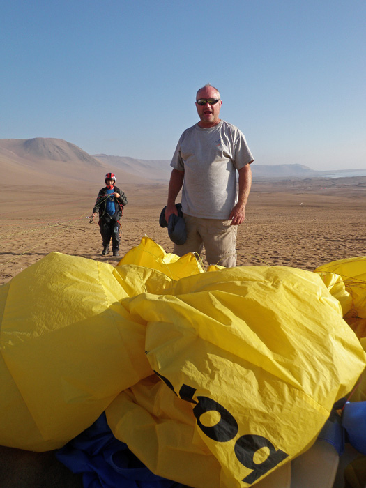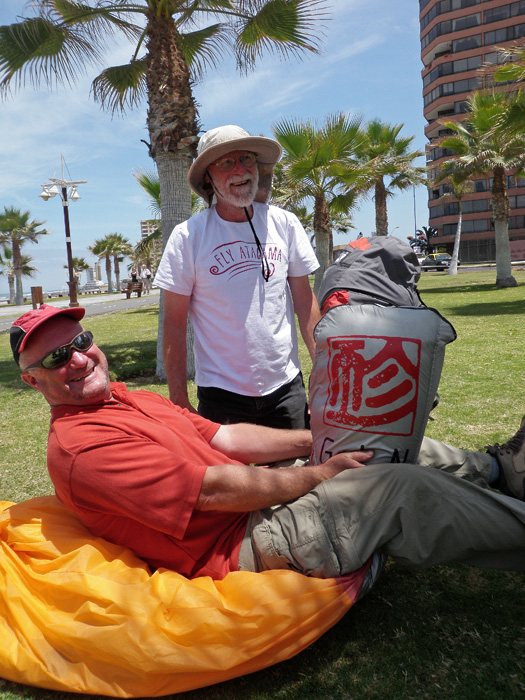 Chuck: November 8, 2011. Arriving at the airport in Iquique, Chile (about 1000 miles north of Santiago), we were met by our local guide, Jarek (Yar–eck). Jarek gave us the choice of going to Palo Buque, the nearby afternoon flying site, or directly to our condo in the city. After a long days' travel, we elected the condo, knowing there would be plenty of time to fly in the next 16 days. I'm rooming with Bruce Moffatt and Ned Israelsen, but Ned won't arrive until tomorrow. This is the third Iquique trip for each of us. Our guides are Ken Hudonjorgensen of Two–Can Fly in Salt Lake area and Jarek Wieczorek of Antofaya Expeditions in Chile. They organize this trip each November. Ken was my original paragliding instructor, and is considered one of the grandfathers of the sport in the US. Jarek was born in Poland, worked as an internet entrepreneur in the US, quit young, and set off to find the best flying in the world. He found it in Iquique, and decided to stay. Now he lives there full time, flying most days when he's not backpacking in the Andes or guiding Patagonia glacier expeditions. Jarek knows the local flying as well as anyone, and has made several XC flights nearing 200 KM. Our two hard working van drivers, Daniel and Leo, are accomplished local pilots, helping to make our flying fun and easy. In the morning, we drive up the nearby coastal range to Alto Hospicio, about 1600 feet above the city, where every pilot in town gathers. The launch is large and friendly. With no lift, it's a great morning sled ride site, with an easy glide to the closest beach. However, I'm holding out for the thermals. Just below the ridge is the huge Dragon Dune. Viewed from above it resembles a dragon's tail, about 700' tall and more than a mile long. Beyond the dune lies the city, then the ocean. All your weather knowledge will likely tell you this would NOT make for a good morning thermal flight: the ridge faces away from the sun, the ocean breeze should be breaking up the thermals, and it's kind of cloudy. Your weather knowledge would be wrong. By 9:30, the turkey vultures are making big, lazy circles in front of launch, and by 10 we are flying, working our way along the consistent house thermals, heading a few miles to the north. We need to climb to about 2500' to assure a safe crossing at the widest part of the city. We absolutely MUST have sufficient altitude before we leave the trusty lift along the ridge, as there are NO landing options in the city. Once you leave for the beach, a couple of miles away, you're committed. The thermals along the ridge were somewhat bumpy, but the city crossing was glassy smooth. There are several miles of landable beach. It's usually possible to glide out over the ocean before landing, where we often see seals or even manta rays playing in the surf. We landed on the beach just after noon, across from the condo. Bruce and I grabbed some lunch and headed back to the condo for a short nap. We were leaving for Palo Buque at 3 pm. |